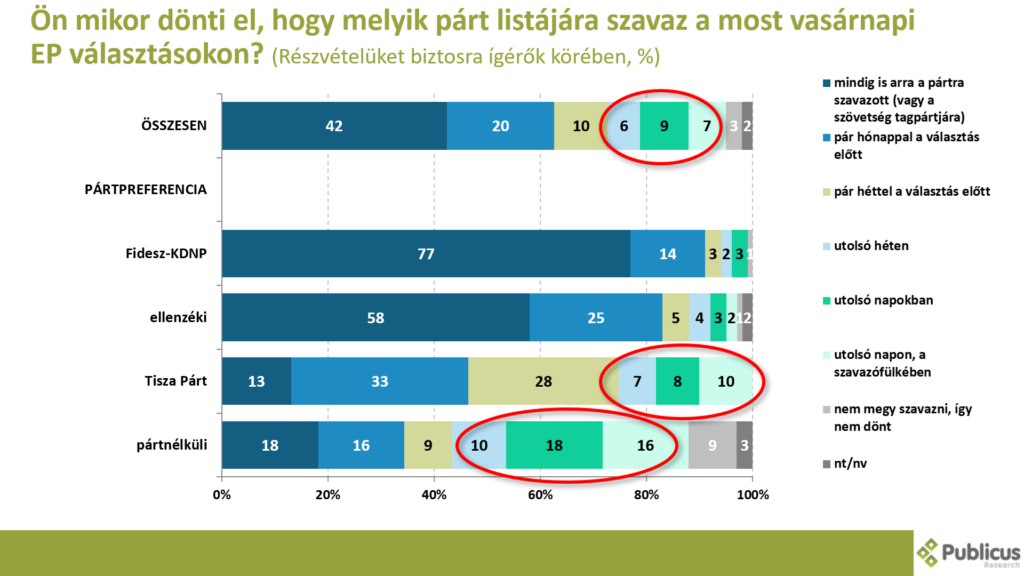 Az EP választások előtti kutatások során bizonytalanságot vetített előre, hogy a megkérdezettek különösen nagy aránya, 22 százaléka jelezte, hogy az utolsó napokban, vagy akár a szavazófülkében fogja eldönteni, hogy kire szavaz. Praktikusan ez azt jelenti, hogy ezen szavazók döntése az választás előtti utolsó kutatásunk után születik meg.