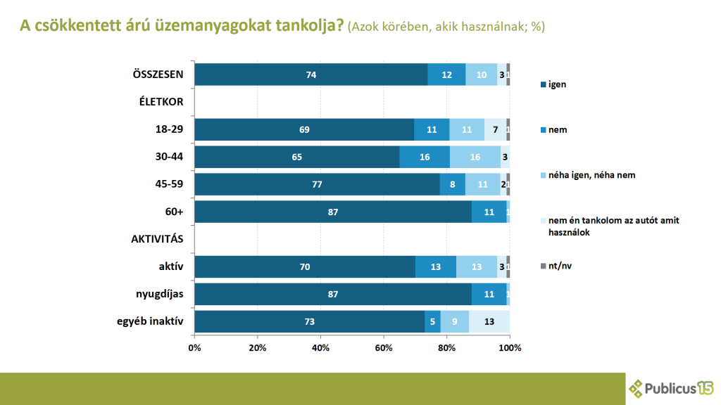 A válaszadók 12 százaléka közölte, hogy nem tankol csökkentett árú üzemanyagokat. Leginkább a 30-44 év közöttiek (16 százalék), illetve az aktív dolgozó státuszúak (13 százalék) mondták ezt.