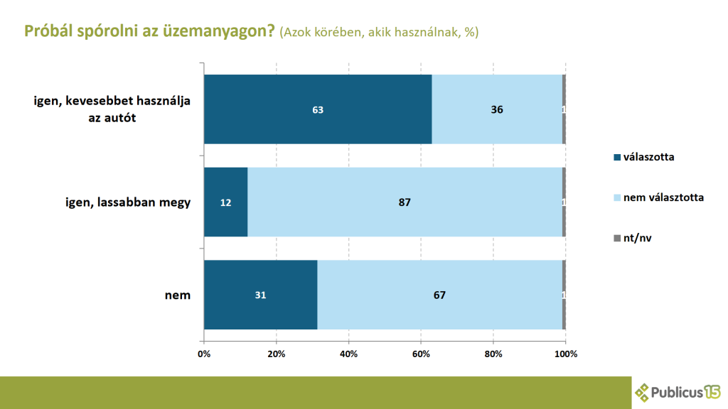 Tízből hat (63 százalék) megkérdezett mondta azt, hogy úgy próbál spórolni az üzemanyagon, hogy kevesebbet használja az autót. Minden tizedik (12 százalék) válaszadó nyilatkozott úgy, hogy úgy spórol a benzinen, hogy lassabban próbál menni. Tízből három (31 százalék) megkérdezett pedig azt mondta, hogy nem próbál spórolni az üzemanyagon.