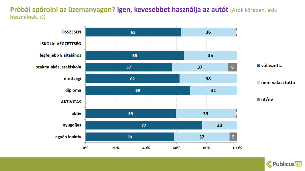 Leginkább a nyugdíjasok (77 százalék), a diplomások (69 százalék), illetve a legfeljebb 8 általánost végzettek mondták azt, hogy úgy próbálnak spórolni az üzemanyagon, hogy kevesebbet használják az autót.