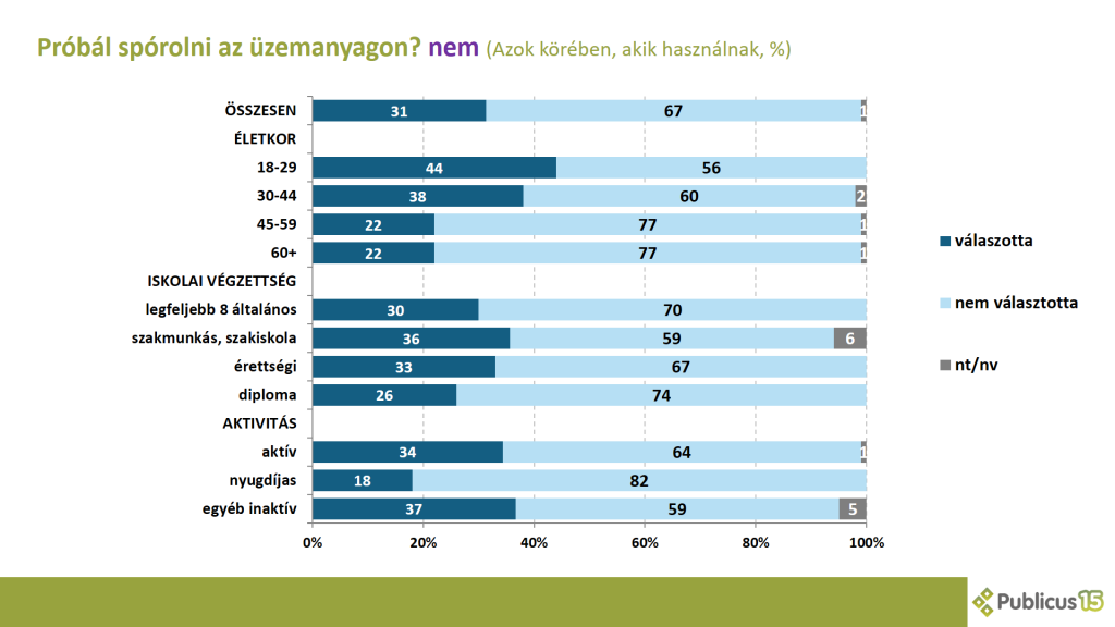 Leginkább a 18-29 év közöttiek (44 százalék), a 30-44 év közöttiek (38 százalék), a szakmunkások (36 százalék), illetve az aktív dolgozó státuszúak (34 százalék) mondták azt, hogy nem spórolnak az üzemanyagon. A nyugdíjasoknál a legkisebb ez az arány, ők mondták a legkevésbé (18 százalék) hogy nem is próbálnak spórolni a benzinen.