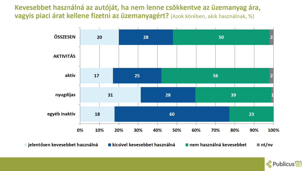 Minden ötödik (20 százalék) válaszadó mondta azt, hogy jelentősen kevesebbet használná az autóját, ha nem lenne csökkentve az üzemanyag ára, vagyis a piaci árat kellene fizetnie az üzemanyagért. Leginkább a nyugdíjasok (31 százalék) nyilatkoztak így.