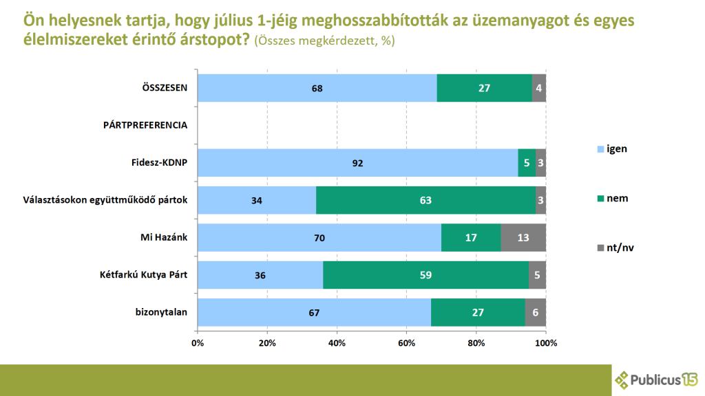 A válaszadók negyede (27 százalék) nem tartja helyesnek, hogy meghosszabbították az üzemanyagok és egyes élelmiszereket érintő árstopot. Leginkább a választásokon együttműködő ellenzéki pártok szavazói (63 százalék).