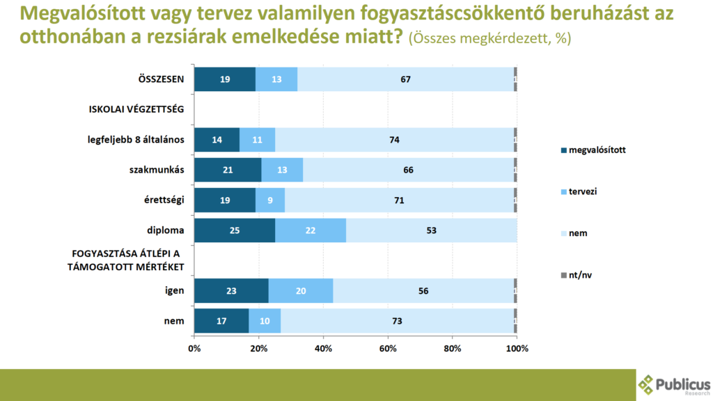 Minden harmadik megkérdezett (32 százalék) mondta azt, hogy vagy tervez (13 százalék), vagy pedig megvalósított (19 százalék) valamilyen fogyasztáscsökkentő beruházást az otthonában a rezsiárak emelkedése miatt. Leginkább a diplomások (47 százalék) mondták ezt. Azok közül, akik átlépik a fogyasztás támogatott mértékét, tízből négyen (43 százalék) nyilatkoztak így, akik pedig nem lépik túl a határt, minden negyedik (27 százalék).