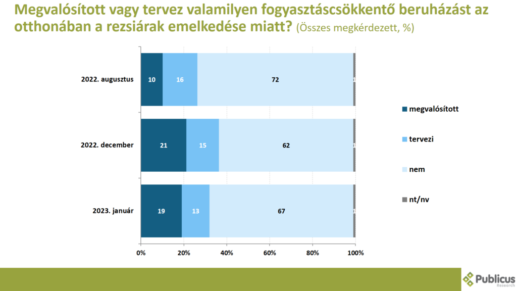 2022 augusztusában a megkérdezettek negyede (26 százalék) mondta azt, hogy vagy tervez (16 százalék), vagy pedig megvalósított (10 százalék) valamilyen fogyasztáscsökkentő beruházást az otthonában a rezsiárak emelkedése miatt. 2022 decemberében 36 százalék volt ez az arány, 2023 januárjában pedig 33 százalék.