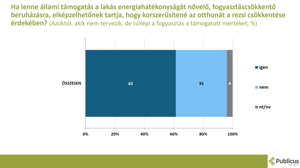 Azok közül, akik nem tervezik, de túllépik a fogyasztás támogatott mértékét, tízből hatan (62 százalék) mondták azt, hogyha lenne állami támogatás a lakás energiahatékonyságát növelő, fogyasztáscsökkentő beruházásra, elképzelhetőnek tartja, hogy korszerűsítené az otthonát a rezsi csökkentése érdekében. A válaszadók harmada (35 százalék) ilyen esetben sem vágna bele egy ilyen projektbe.