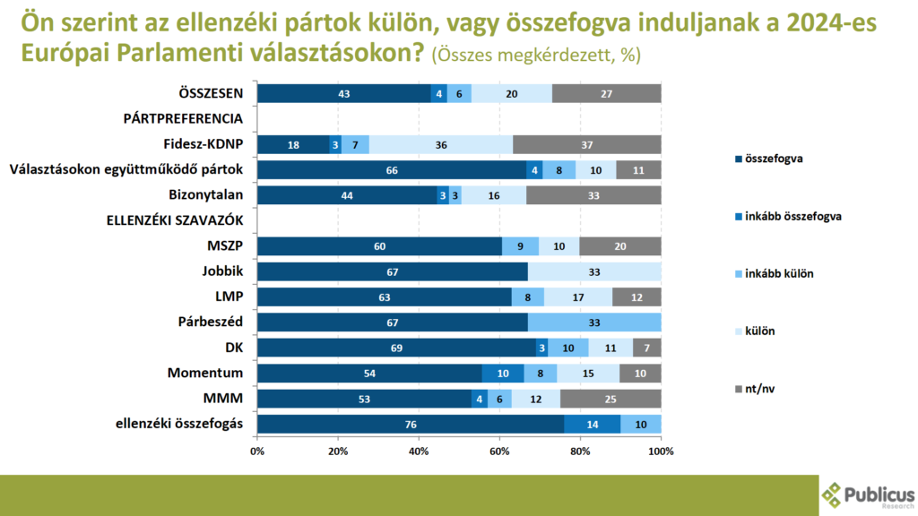 Közel minden második (47 százalék) válaszadó mondta azt, hogy vagy összefogva (43 százalék), vagy pedig inkább összefogva (4 százalék) induljanak az ellenzéki pártok a 2024-es Európai Parlamenti választáson. A választásokon együttműködő ellenzéki pártok szavazói közül tízből heten (70 százalék) nyilatkoztak így. A bizonytalan szavazóknál 47 százalék ez az arány, a Fidesz szavazóknál pedig 21 százalék.
