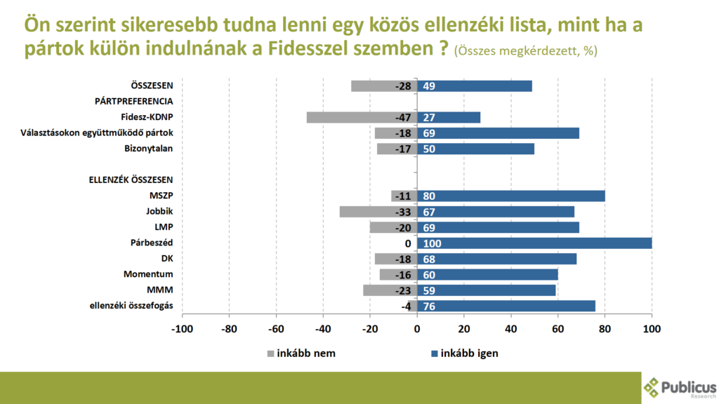 Minden második (49 százalék) megkérdezett szerint sikeresebb tudna lenni egy közös ellenzéki lista, mint ha a pártok külön indulnának a Fidesszel szemben. Így gondolja a választásokon együttműködő ellenzéki pártok szavazói közül tízből hét (69 százalék), minden második (50 százalék) bizonytalan szavazó, illetve a Fidesz szavazók negyede (50 százalék).
