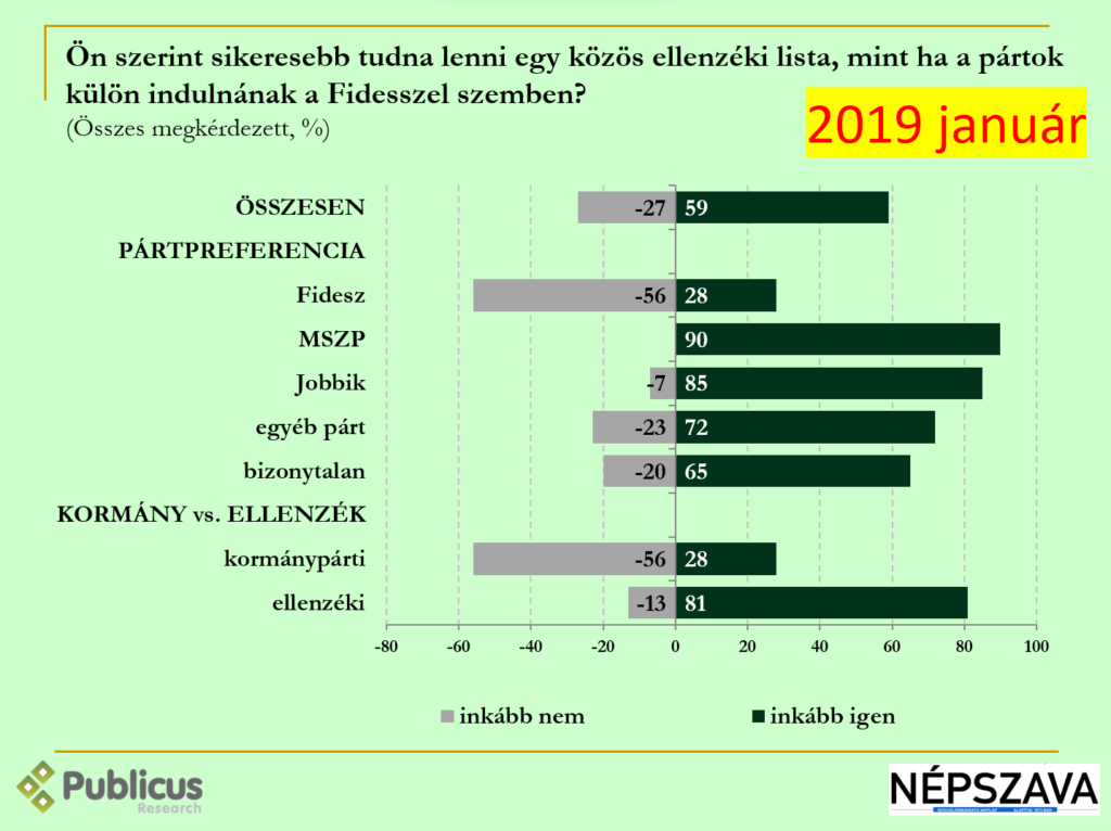 Az előző Európai Parlamenti választás előtt, 2019 januárjában tízből hat (59 százalék) válaszadó mondta azt, hogy sikeresebb tudna lenni egy közös ellenzéki lista, mint ha a pártok külön indulnának a Fidesszel szemben. Akkor így nyilatkozott az ellenzéki szavazók 81 százaléka, a bizonytalan szavazók 65 százaléka, illetve a Fidesz szavazók 28 százaléka.