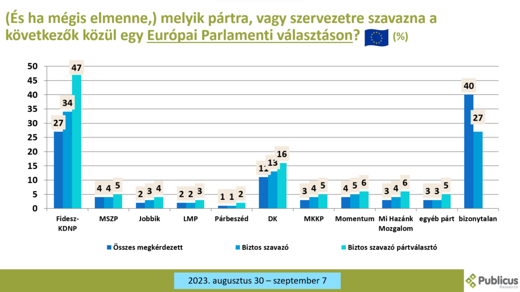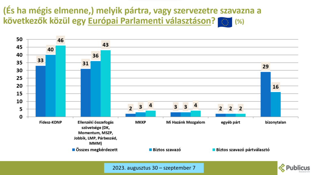 Publicus Intézet augusztus 30. – szeptember 7. között 1000 fő megkérdezésével készített országos reprezentatív közvéleménykutatásban kérdezte az embereket az Európai Parlamenti választással kapcsolatban.