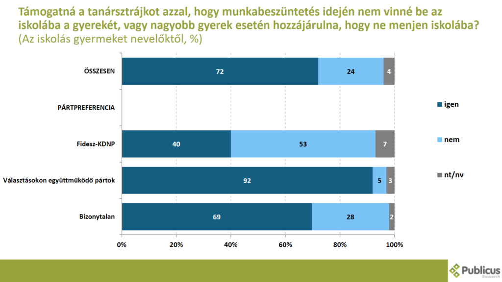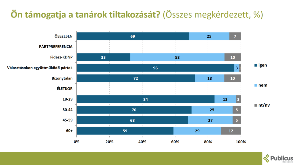 Tízből hét (69 százalék) megkérdezett támogatja a tanárok tiltakozását. Ezt mondta a választásokon együttműködő ellenzéki pártok szavazói közül szinte az összes (96 százalék), a bizonytalan szavazók közel háromnegyede (72 százalék), illetve a Fidesz szavazók harmada (33 százalék).