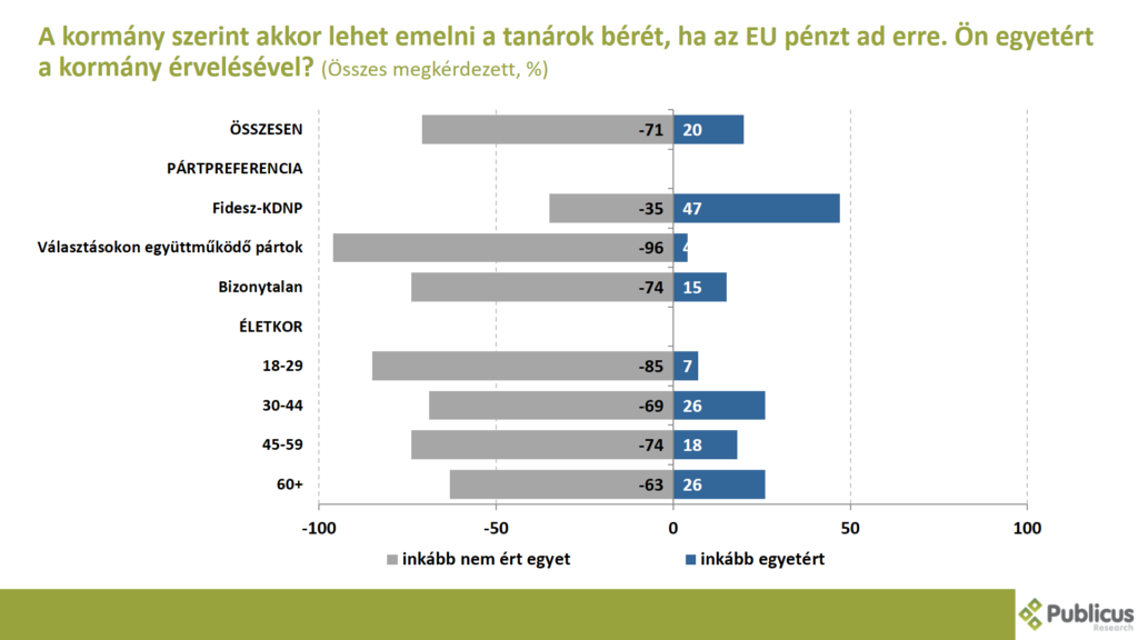 Tízből hét (71 százalék) válaszadó inkább nem ért egyet a kormány érvelésével, miszerint akkor lehet emelni a tanárok bérét, ha az EU pénzt ad erre. Ezt mondta a választásokon együttműködő ellenzéki pártok szavazói közül szinte az összes (96 százalék), a bizonytalan szavazók háromnegyede (74 százalék), illetve a Fidesz szavazók harmada (35 százalék).