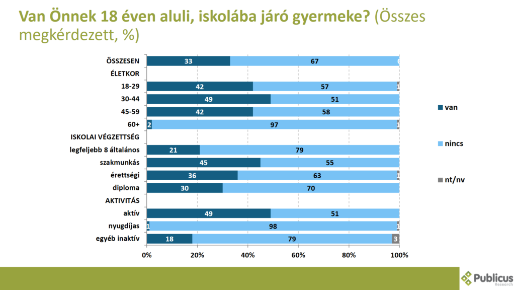 Minden harmadik (33 százalék) megkérdezett mondta azt, hogy van neki 18 éven aluli, iskolába járó gyermeke. Így nyilatkozott a 18-29 év közöttiek és a 45-59 év közöttiek 42 százaléka, illetve a 30-44 év közöttiek 49 százaléka.
