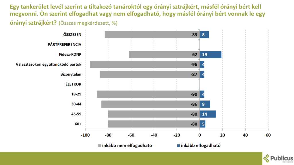 Egy tankerület levél szerint a tiltakozó tanároktól egy órányi sztrájkért másfél órányi bért kell megvonni. Tízből nyolc (83 százalék) megkérdezett szerint inkább nem elfogadható az, hogy másfél órányi bért vonnak le egy órányi sztrájkért. Így gondolja választásokon együttműködő ellenzéki pártok szavazói közül szinte az összes (96 százalék), tízből kilenc (87 százalék) bizonytalan szavazó, illetve tízből hat (62 százalék) Fidesz szavazó.