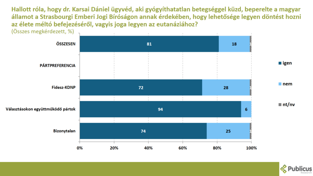 Tízből nyolc (81 százalék) megkérdezett hallott róla, hogy dr. Karsai Dániel ügyvéd, aki gyógyíthatatlan betegséggel küzd, beperelte a magyar államot a Strasbourgi Emberi Jogi Bíróságon annak érdekében, hogy lehetősége legyen döntést hozni az élete méltó befejezéséről, vagyis joga legyen az eutanáziához. Így nyilatkozott a választásokon együttműködő ellenzéki pártok szavazói közül szinte az összes (94 százalék), a bizonytalan szavazók háromnegyede (74 százalék), illetve tízből hét (72 százalék) Fidesz szavazó.