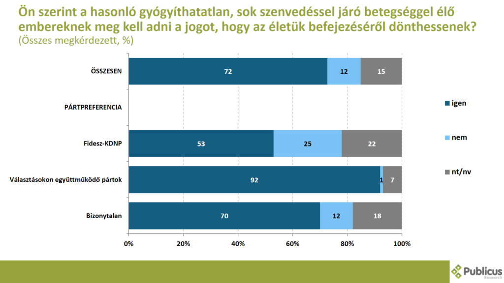 Tízből hét (72 százalék) válaszadó szerint a hasonló gyógyíthatatlan, sok szenvedéssel járó betegséggel élő embereknek meg kell adni a jogot, hogy az életük befejezéséről dönthessenek. Így gondolja a választásokon együttműködő ellenzéki pártok szavazói közül tízből kilenc (92 százalék), tízből hét bizonytalan szavazó (70 százalék), illetve a Fidesz szavazók enyhe többsége (53 százalék).