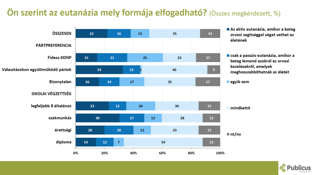 A válaszadók harmada (35 százalék) szerint az eutanázia aktív és passzív formája is elfogadható. Így gondolja a választásokon együttműködő ellenzéki pártok szavazóinak a közel fele (46 százalék), a bizonytalan szavazók harmada (35 százalék), illetve a Fidesz szavazók közel negyede (23 százalék). Leginkább a diplomások (54 százalék) látják ezt így.