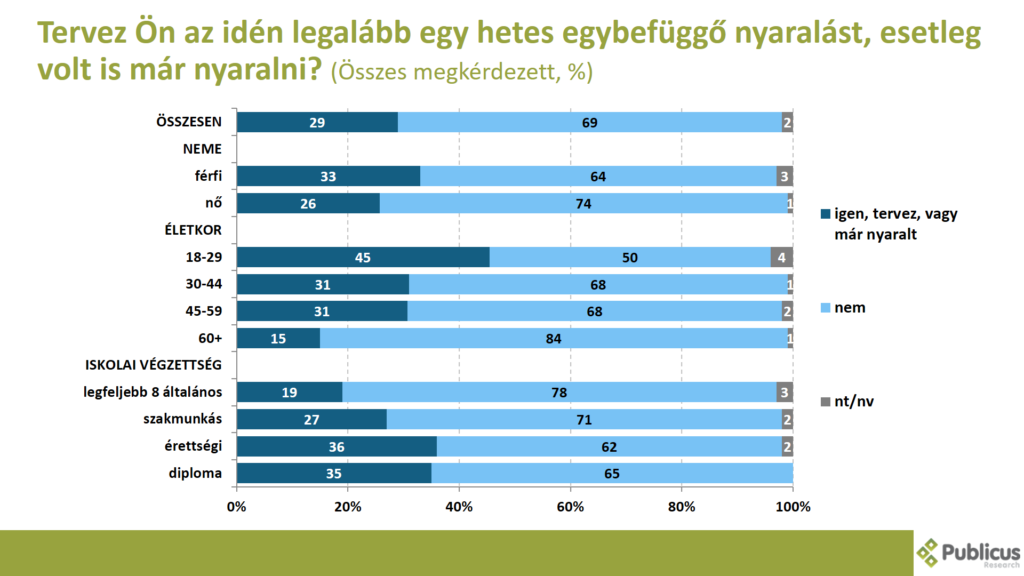 Tízből három válaszadó mondta azt, hogy vagy már volt, vagy pedig tervez az idén legalább egy hetes egybefüggő nyaralást. Leginkább a 18-29 év közöttiek (45 százalék), az érettségivel és diplomával rendelkezők (36 és 35 százalék), illetve a férfiak (33 százalék) nyilatkoztak így,