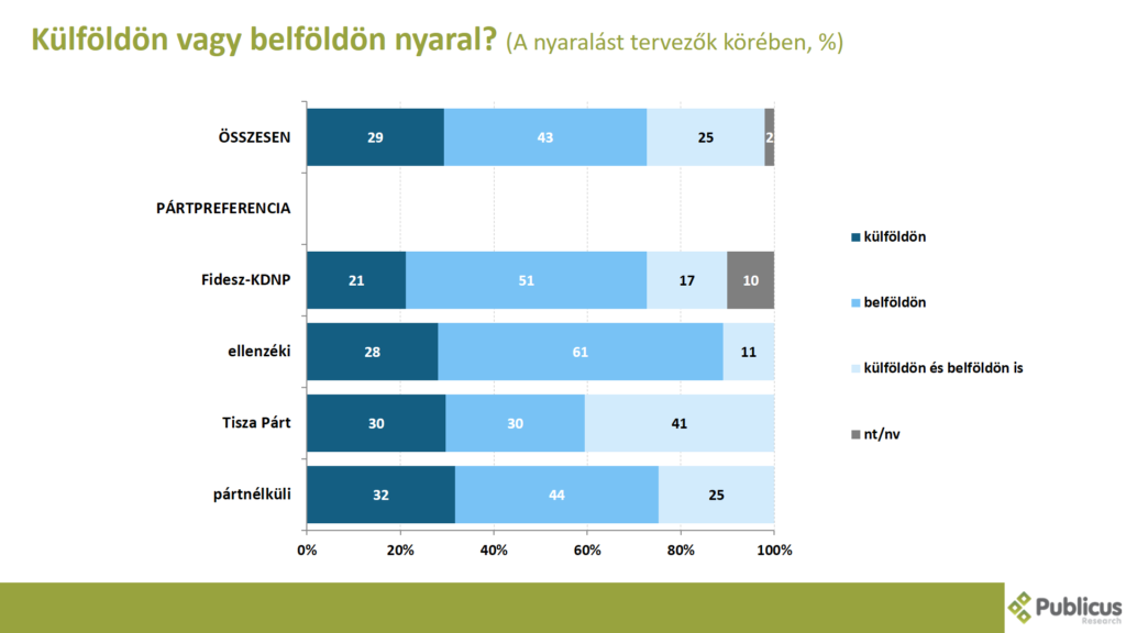 A nyaralást tervezők körében tízből négy (43 százalék) válaszadó mondta azt, hogy belföldre ment vagy megy pihenni. Így nyilatkozott az ellenzéki szavazók 61 százaléka, a Fidesz szavazók 51 százaléka, a pártnélküliek 44 százaléka, illetve a Tisza Párt szavazóinak a 30 százaléka.