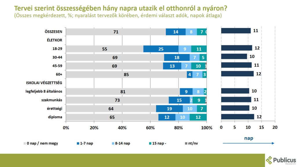 A válaszadók 14 százaléka 1-7 napot, 8 százaléka 8-14 napot, 7 százaléka pedig 15 napnál többet megy nyaralni.