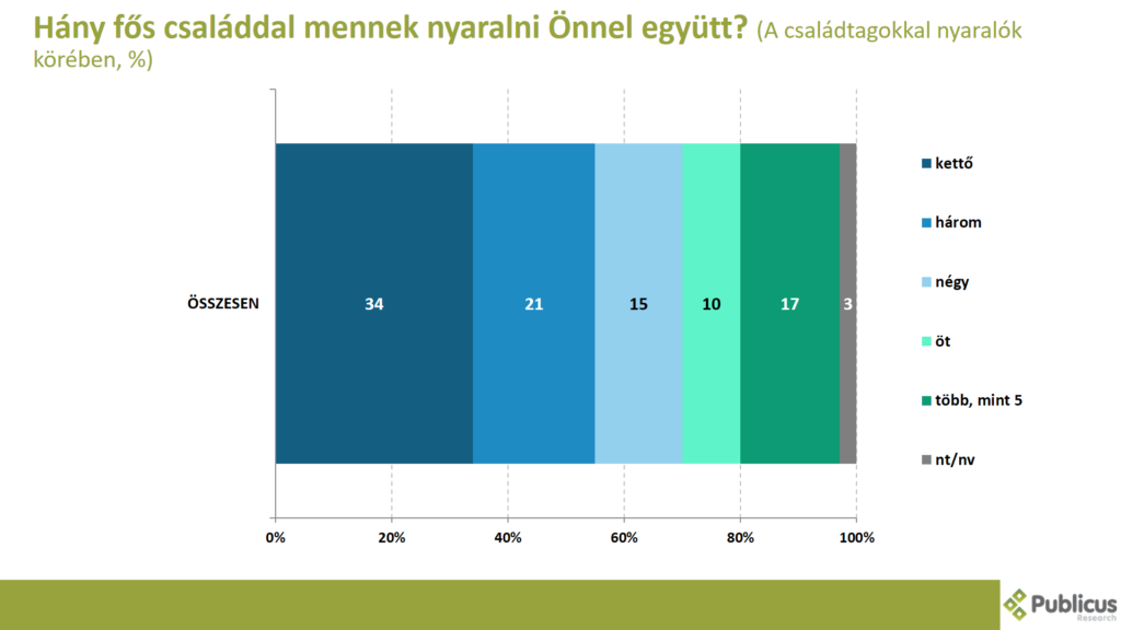 A családtagokkal nyaralók körében a válaszadók harmada (34 százalék) két fős családdal, ötöde (21 százalék) három fős családdal, 15 százalék négy fős, 10 százalék 5 fős, 17 százalék pedig több mint öt fős családdal megy nyaralni.
