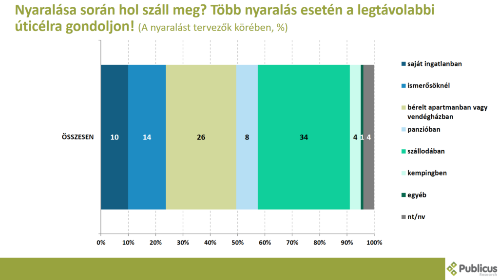 A megkérdezettek harmada (34 százalék) szállodában, negyede (26 százalék) bérelt apartmanban vagy vendégházban, 14 százalék ismerősöknél, 10 százalék saját ingatlanban, 8 százalék panzióban, 4 százalék kempingben, 1 százalék pedig egyéb helyen száll meg a nyaralása alatt.