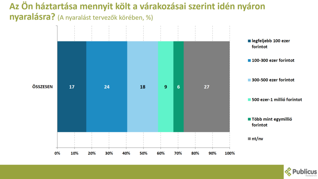 A nyaralók/nyaralni tervezők közül a válaszadók negyede (24 százalék) háztartásonként 100-300 ezer forintot, 18 százalék 300-500 ezer forintot, 17 százalék legfeljebb 100 ezer forintot, 9 százaléka 500 ezer forint és 1 millió között, 6 százalék pedig több mint egy millió forintot tervez költeni.