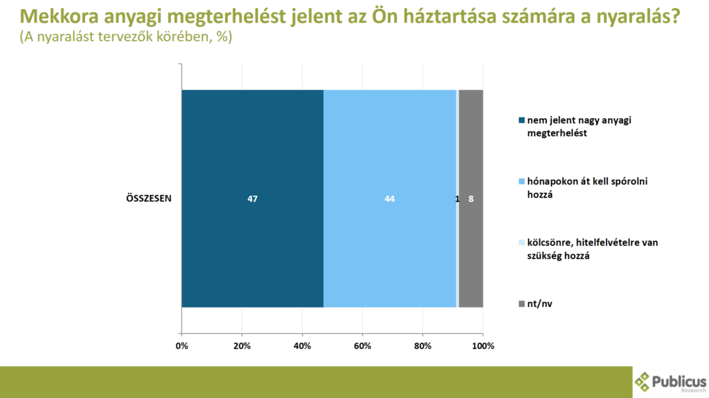 A nyaralást tervezők körében a válaszadók 44 százaléka mondta azt, hogy akkora megterhelést jelent neki és a háztartása számára a nyaralás, hogy hónapokon keresztül kell spórolnia hozzá. További 1 százalék még kölcsönt is vesz fel hozzá. A megkérdezettek 47 százalékának azonban nem jelent nagy anyagi megterhelést a nyaralás.