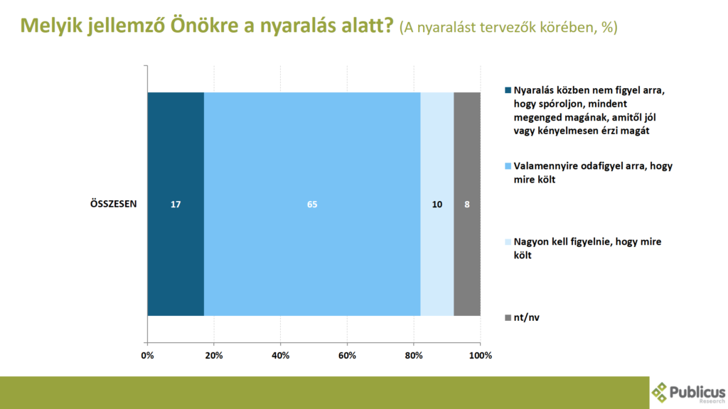 A válaszadók 17 százaléka a nyaralás közben nem figyel arra, hogy spóroljon, mindent megenged magának, amitől jól vagy kényelmesen érzi magát. A megkérdezettek kétharmada (65 százalék) valamennyire odafigyel arra, hogy mire költ. Minden tizedik (10 százalék) válaszadó mondta azt, hogy nagyon kell figyelnie, hogy mire költ.