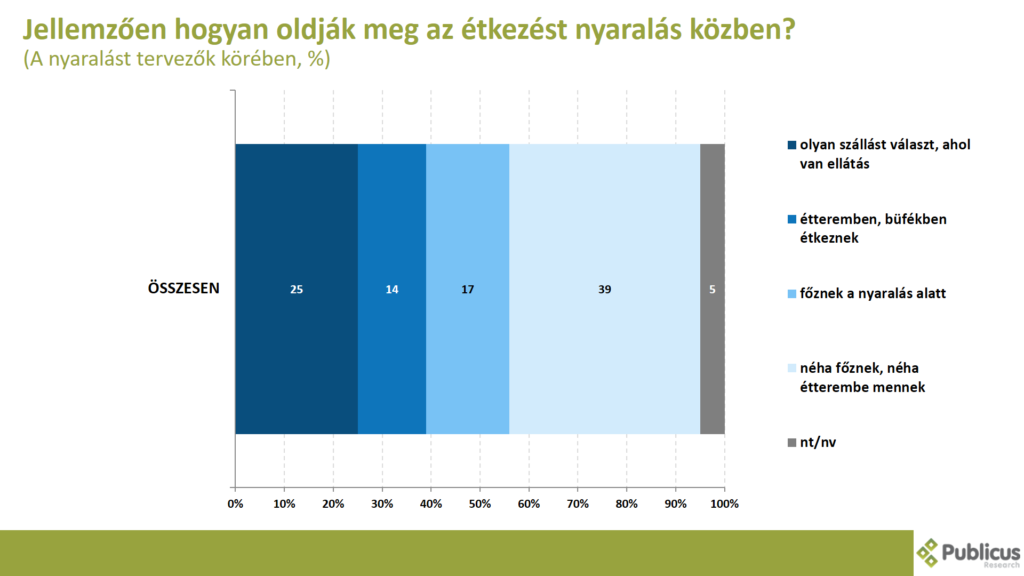 A megkérdezettek 14 százaléka étteremben, büfében oldja meg az étkezést a nyaralás során, 17 százalék főz a nyaralást alatt, 39 százaléka pedig néha főz és néha étterembe megy. A válaszadók negyede (25 százalék) olyan szállást választ, ahol van ellátás.