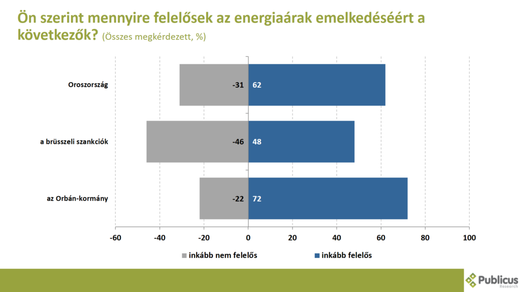 Tízből hét (72 százalék) megkérdezett szerint az Orbán-kormány inkább felelős az energiaárak emelkedéséért. Tízből hatan (62 százalék) Oroszországot, minden második (48 százalék) válaszadó pedig a brüsszeli szankciókat nevezték meg.