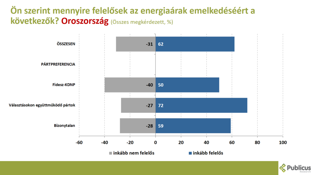 A választásokon együttműködő ellenzéki pártok szavazói közül tízből hét (72 százalék), tízből hat (59 százalék) bizonytalan szavazó, illetve a tízből öt (50 százalék) Fidesz szavazó 52 szerint Oroszország inkább felelős az energiaárak emelkedéséért.