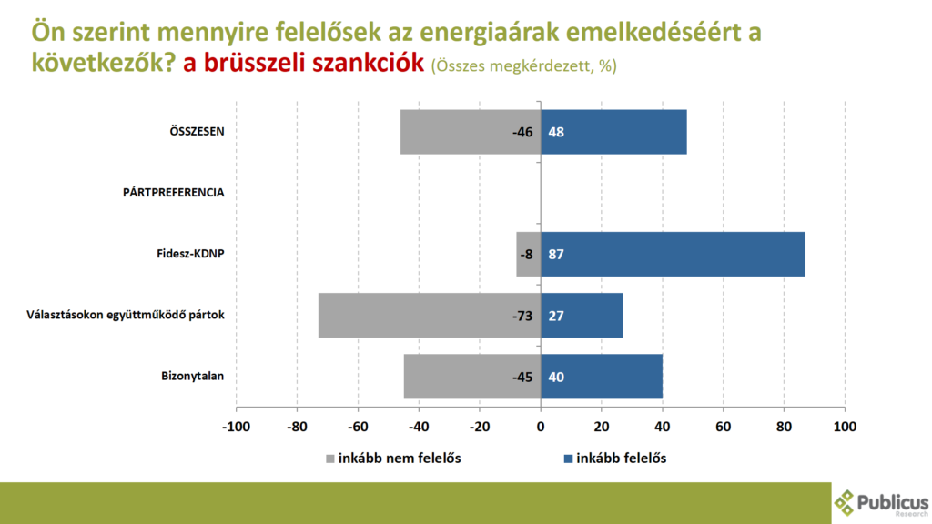 Tízből közel kilenc (87 százalék) Fidesz szavazó, tízből négy (40 százalék) bizonytalan szavazó, illetve a választásokon együttműködő ellenzéki pártok szavazóinak a negyede (27 százalék) szerint a brüsszeli szankciók inkább felelősek az energiaárak emelkedéséért.
