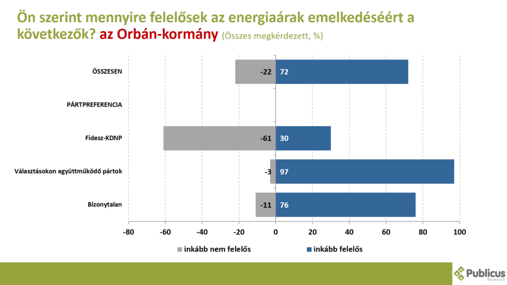A választásokon együttműködő ellenzéki pártok szavazói közül majdnem az összes (97 százalék), a bizonytalan szavazók háromnegyede (76 százalék) illetve tízből három (30 százalék) Fidesz szavazó szerint az Orbán-kormány inkább felelős az energiaárak emelkedéséért.