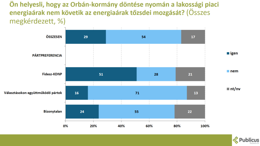 Tízből három (29 százalék) megkérdezett helyesli a magyar kormány döntését, hogy a lakossági piaci energiaárak ne kövessék az energiaárak tőzsdei mozgását. Ezt mondta minden második (51 százalék) Fidesz szavazó, a bizonytalan szavazók negyede (24 százalék), illetve a választásokon együttműködő ellenzéki pártok szavazóinak a hatoda (16 százalék). A Fidesz szavazóknál 2022 januárjában még 75 százalék volt ez az arány.