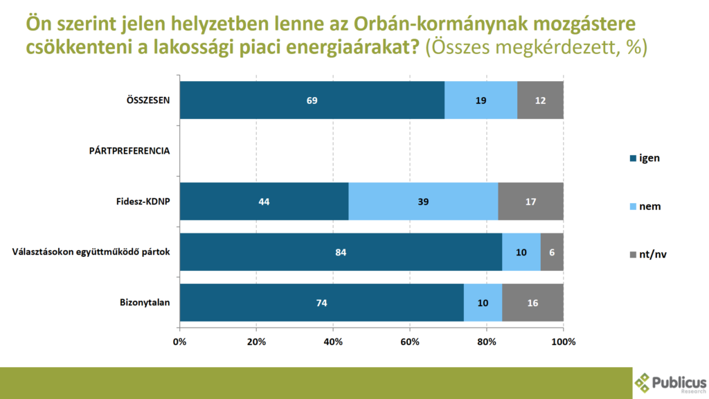 Tízből hét (69 százalék) megkérdezett szerint a jelen helyzetben lenne az Orbán-kormánynak mozgástere csökkenteni a lakossági piaci energiaárakat. Így gondolja a választásokon együttműködő ellenzéki pártok szavazóinak a túlnyomó többsége (84 százalék), a bizonytalan szavazók háromnegyede (74 százalék), illetve a Fidesz szavazók kevesebb mint fele (44 százalék). 2022 januári felmérésünk során is közel ugyanilyen arányok jöttek ki.