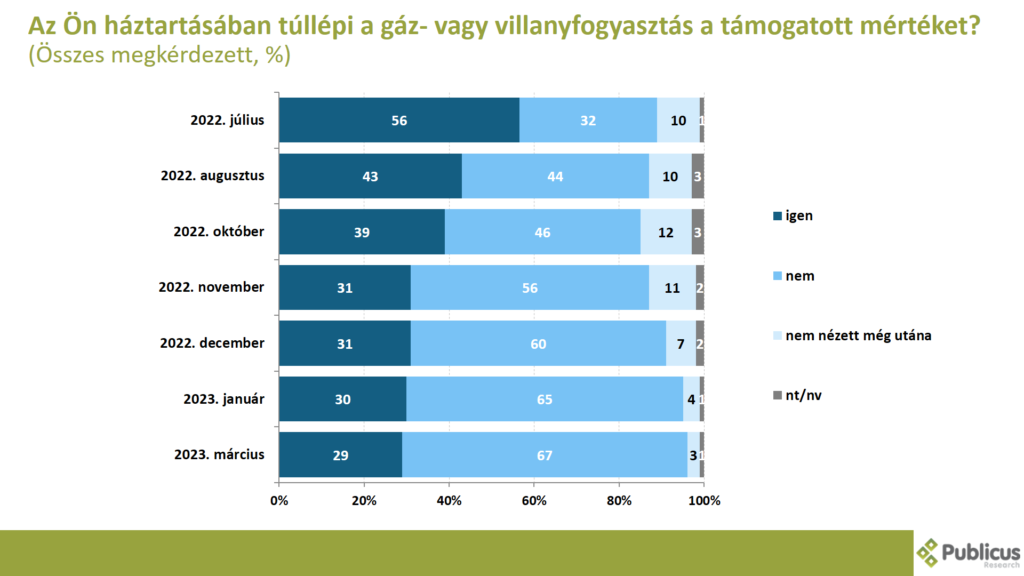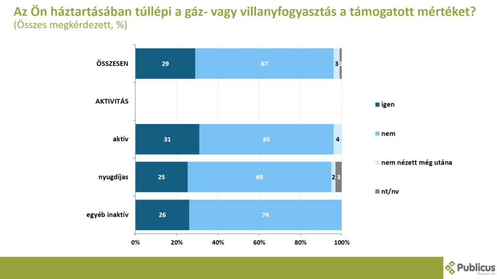 Tízből három (30 százalék) válaszadó mondta azt, hogy a háztartásában túllépi a gáz- vagy villanyfogyasztás államilag támogatott mértéket. Az aktív foglalkoztatottak inkább (31 százalék) mint a nyugdíjasok (25 százalék).