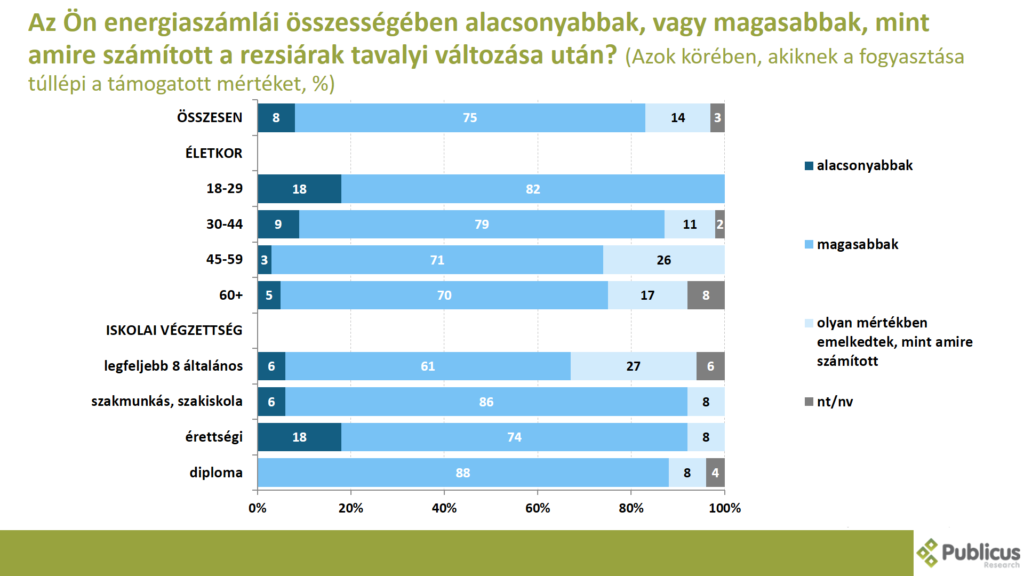 A megkérdezettek háromnegyede (75 százalék) mondta azt, hogy az energiaszámlái összességében magasabbak, mint amire számított a rezsiárak tavalyi változása után. Leginkább a 18-29 év közöttiek (82 százalék), a szakmunkások (86 százalék), és a diplomások (88 százalék) közölték ezt.