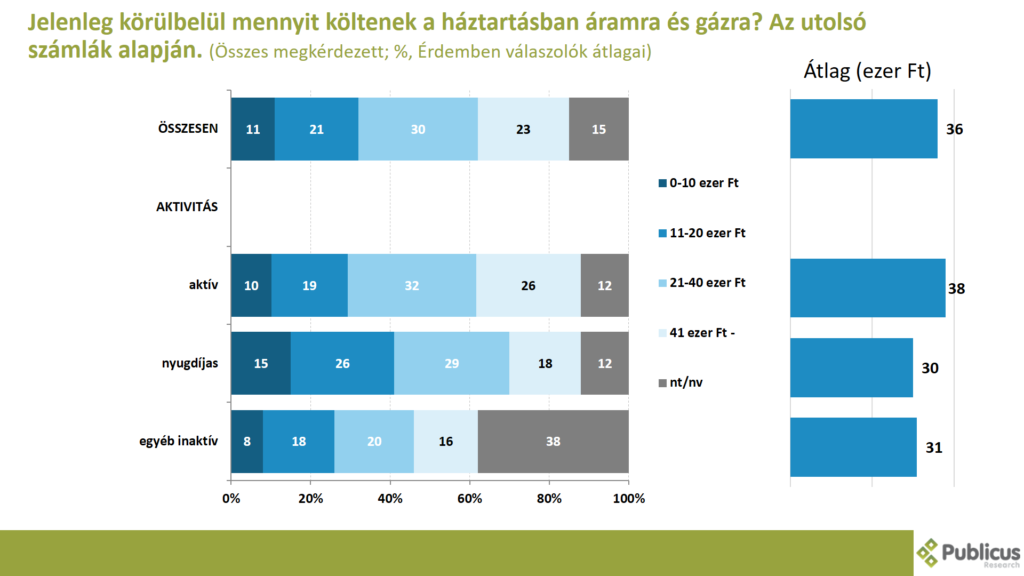 A válaszadók átlagban 36.000 forintot költenek a háztartásukban áramra és gázra az utolsó számlák alapján. Tízből három (30 százalék) válaszadó 21-40 ezer forintot, minden negyedik (23 százalék) 41 ezer forint felett, minden ötödik (21 százalék) 11-20 ezer forintot, minden tizedik (11 százalék) megkérdezett pedig 10 ezer forint alatti összeget költ rezsire. Az aktív foglalkoztatottak átlagban 38 ezer forintot, a nyugdíjasok 30 ezer forintot, az egyéb inaktívok pedig 31 ezer forintot költenek a háztartásban áramra és gázra.
