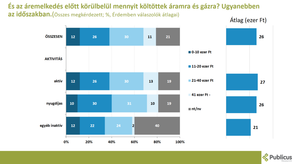 Még az áremelkedés előtt – ugyanebben az időszakban – a megkérdezettek átlagban 26 ezer forintot költöttek rezsire. Tízből három (30 százalék) válaszadó 21-40 ezer forintot, a megkérdezettek negyede (26 százalék) 11-20 ezer forintot, nyolcada (12 százalék) 10 ezer forint alatt, kilencede (11 százalék) pedig 41 ezer forint felett költött rezsire még az áremelkedés előtt. Az aktív foglalkoztatottak átlagban 27 ezer forintot, a nyugdíjasok 26 ezer forintot, az egyéb inaktívok pedig 21 ezer forintot költöttek a háztartásban áramra és gázra.