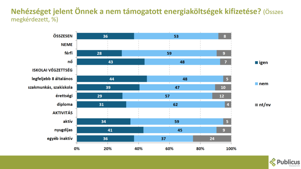 Tízből közel négy (37 százalék) válaszadó mondta azt, hogy nehézséget jelent neki a nem támogatott energiaköltségek kifizetése. Leginkább a legfeljebb 8 általánost végzettek (45 százalék), a nők (44 százalék) és a nyugdíjasok (43 százalék) nyilatkoztak így.