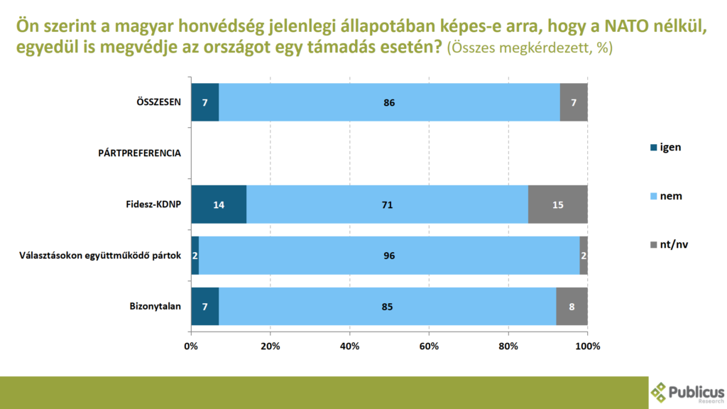 Tízből közel kilenc (86 százalék) megkérdezett szerint a magyar honvédség jelenlegi állapotában nem képes arra, hogy a NATO nélkül, egyedül is megvédje az országot egy támadás esetén. Így gondolja a választásokon együttműködő ellenzéki pártok szavazói közül szinte az összes (96 százalék), tízből közel kilenc (85 százalék) bizonytalan szavazó, illetve tízből hét (71 százalék) Fidesz szavazó.