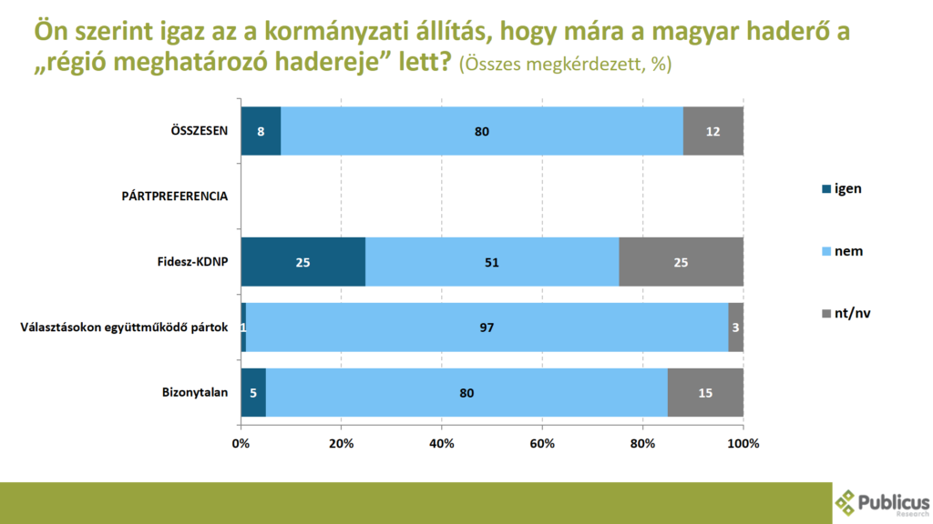 Tízből nyolc (80 százalék) válaszadó szerint nem igaz az a kormányzati állítás, hogy mára a magyar haderő a „régió meghatározó hadereje” lett. Így gondolja a választásokon együttműködő ellenzéki pártok szavazói közül szinte az összes (97 százalék), tízből nyolc (80 százalék) bizonytalan szavazó, illetve minden második (51 százalék) bizonytalan szavazó.
