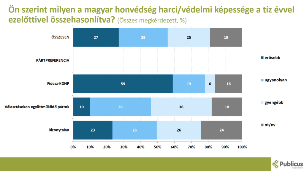 Tízből közel három (27 százalék) megkérdezett szerint a magyar honvédség harci/védelmi képessége a tíz évvel ezelőttivel összehasonlítva erősebb. Így gondolja tízből hat (59 százalék) Fidesz szavazó, a bizonytalan szavazók negyede (23 százalék), illetve a választásokon együttműködő ellenzéki pártok szavazói közül minden tizedik (10 százalék).