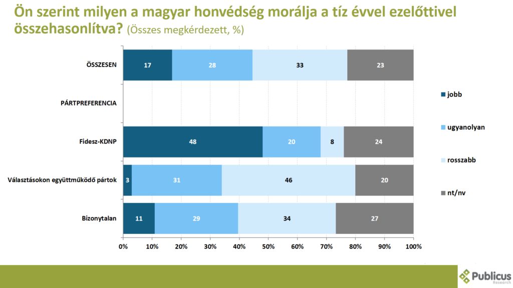 Közel minden hatodik (17 százalék) válaszadó szerint a magyar honvédség morálja a tíz évvel ezelőttihez képest jobb. Így látja minden második (48 százalék) Fidesz szavazó, minden tizedik (11 százalék) bizonytalan szavazó, illetve a választásokon együttműködő ellenzéki pártok szavazóinak a 3 százaléka.