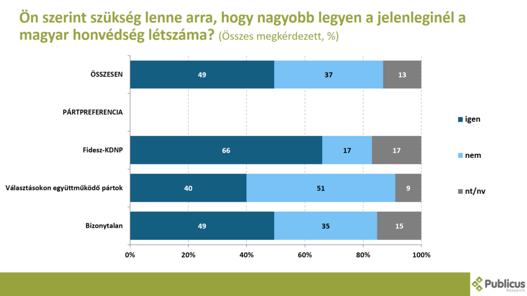 Minden második (49 százalék) megkérdezett szerint szükség lenne arra, hogy nagyobb legyen a jelenleginél a magyar honvédség létszáma. Így gondolja a Fidesz szavazók kétharmada (66 százalék), minden második (49 százalék) bizonytalan szavazó, illetve a választásokon együttműködő ellenzéki pártok szavazói közül tízből négy (40 százalék).
