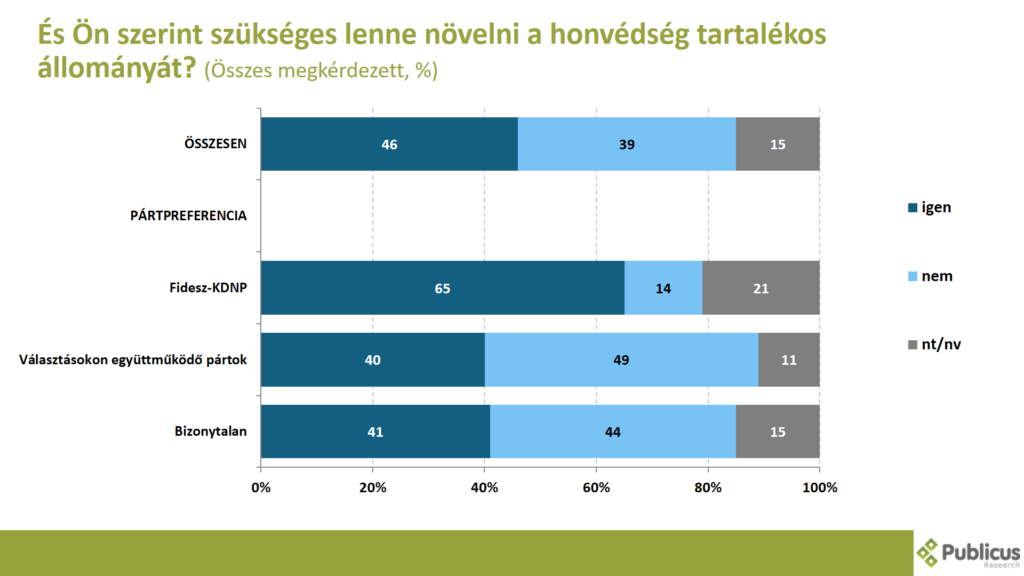 Közel minden második (46 százalék) megkérdezett szerint szükséges lenne növelni a honvédség tartalékos állományát. Így gondolja a Fidesz szavazók kétharmada (65 százalék), a bizonytalan szavazók közül tízből négy (41 százalék), illetve aválasztásokon együttműködő ellenzéki pártok szavazói közül is szintén tízből négy (40 százalék).