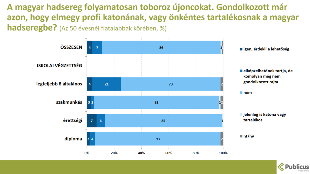 Az 50 évesnél fiatalabbak körében a válaszadók 4 százaléka mondta azt, hogy érdekli az a lehetőség, hogy elmegy profi katonának, vagy önkéntes tartalékosnak a magyar hadseregbe. A megkérdezettek 7 százaléka elképzelhetőnek tartja ezt, de komolyan még nem gondolkodott rajta. A válaszadók 86 százaléka nem számolt ezzel a lehetőséggel.
