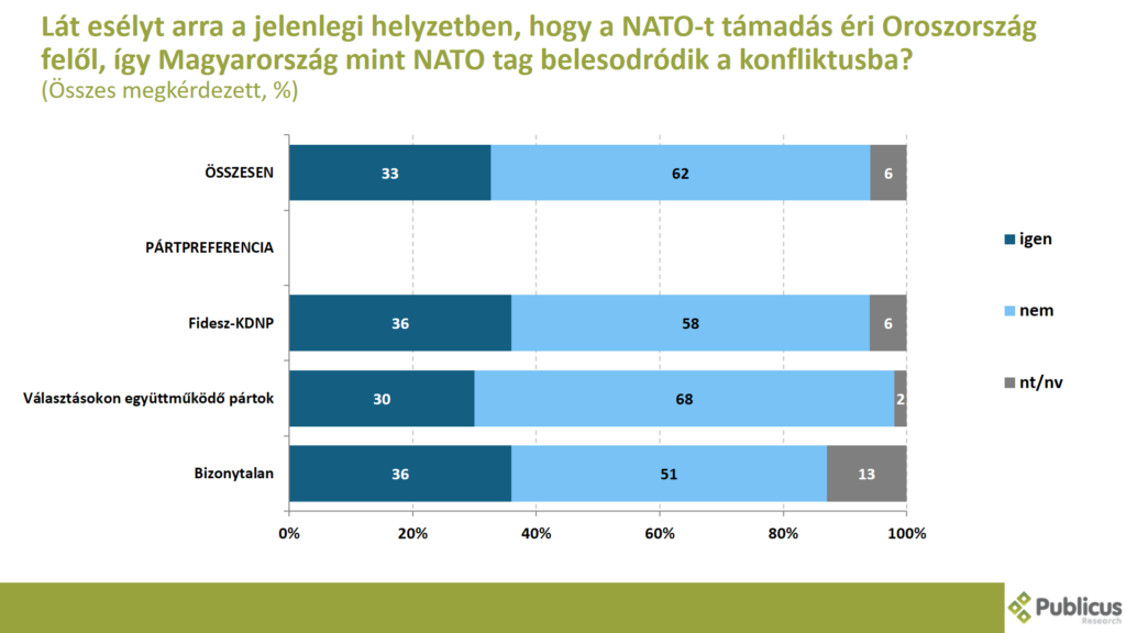 A megkérdezettek harmada (33 százalék) lát esélyt arra a jelenlegi helyzetben, hogy a NATO-t támadás éri Oroszország felől, így Magyarország mint NATO tag belesodródik a konfliktusba. Ezt mondta tízből közel négy Fidesz szavazó és bizonytalan szavazó (36-36 százalék), illetve a választásokon együttműködő ellenzéki pártok szavazói közül tízből három (30 százalék).