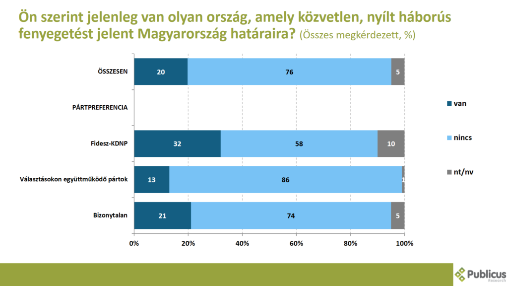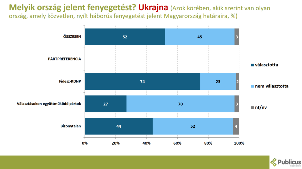 Azok körében, akik szerint van olyan ország, amely közvetlen, nyílt háborús fenyegetést jelent Magyarország határaira, leginkább a Fidesz szavazók (74 százalék) mondták azt, hogy ez az ország Ukrajna. (A bizonytalan szavazók 44 százaléka, illetve a választásokon együttműködő ellenzéki pártok szavazóinak a 27 százaléka mondta még ezt.)